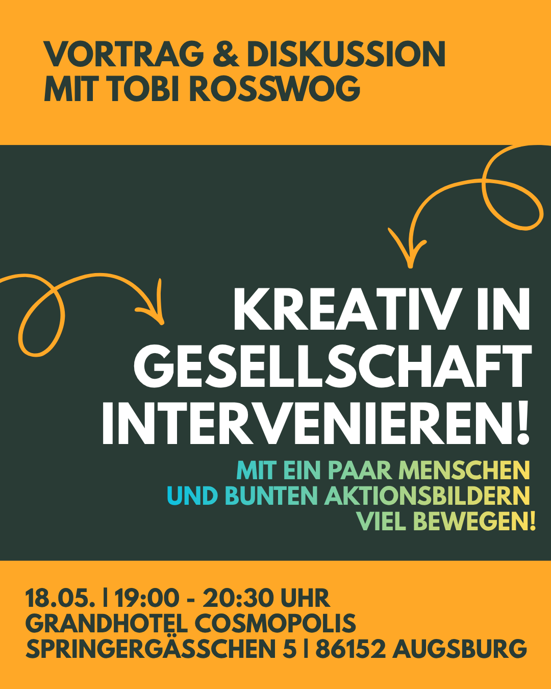 Tobi Rosswog zieht dabei lebendige Beispiele aus über 15 Jahren kreativen Aktivismus für “Das Gute Leben für Alle” heran. Und nach der Aktion kommt meist auch die Repression, der Versuch der Einschüchterung. 2025 versuchte der Medienstaranwalt Prof. Dr. Christian Schertz für Wolfgang Porsche ihn mundtot zu machen. Wie das ausging, erzählt er ebenso. Im Anschluss ist Zeit, um gemeinsam Banden zu bilden. Als Aktivist, freier Dozent und Initiator ist Tobi Rosswog für die sozial-ökologische Transformation unterwegs. Mit all seiner Zeit und Energie setzt er sich für den Wandel hin zu einer Gesellschaft jenseits von Arbeit, Eigentum und Geld ein. Aktuell bildet er mit kämpferischen Kolleg*innen Banden, um die soziale und ökologische Frage zusammen zu denken und danach zu handeln. Er ist überzeugt: Die Kraft der direkten Aktion und kreativer Intervention ist unglaublich stark. Aktivistisch ist den eigenen Alltag als Plattform des Protests zu begreifen und sich als transformatives Subjekt zu verstehen. Denn nur bio und fair zu konsumieren und alle paar Jährchen ein Kreuz an der Stelle des geringsten Übels zu setzen, wird nicht reichen, um den Herausforderungen unserer Zeit wirksam zu begegnen. Es braucht Aktivismus zwischen Widerstand, Austausch & Utopie.
